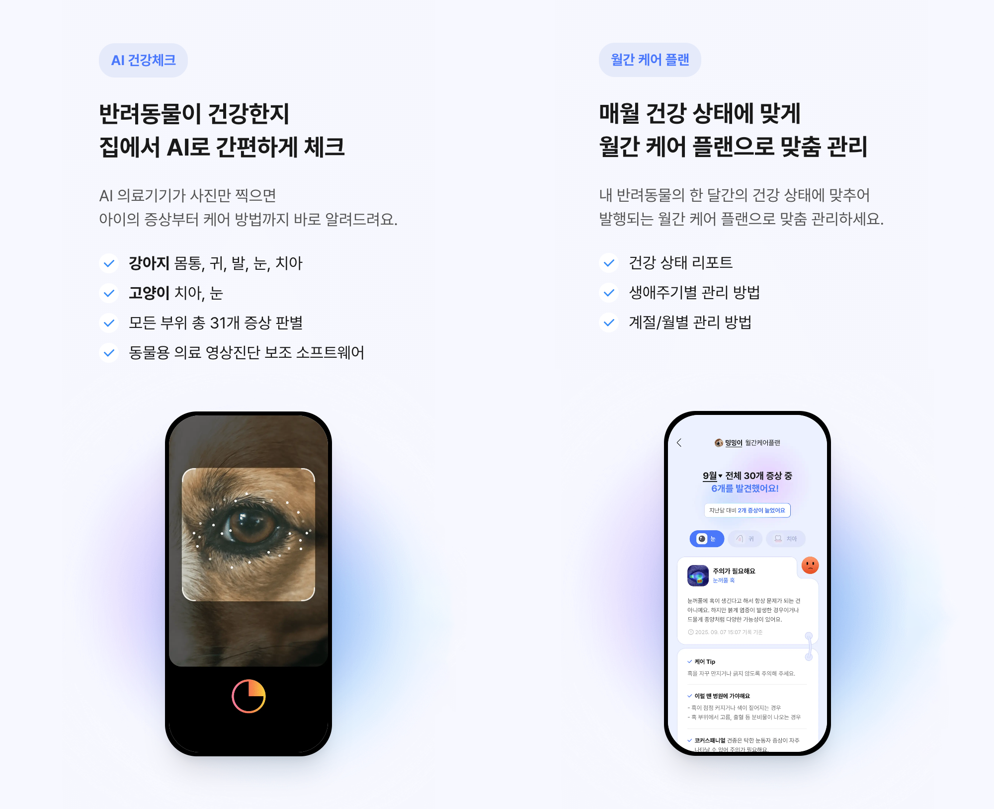 ์ฅ์์ ๋ง๋งํด์ง๊ธฐ ๋ง๋ จ์ด์ผ. ํฐํฐ์ผ์ด๋ ์ด๋ฐ ์๊ฐ์ ์ํด ์ฌ์ง ๊ธฐ๋ฐ AI ๊ฑด๊ฐ์ฒดํฌ ๊ธฐ๋ฅ์ ์ ๊ณตํด. ํด๋ํฐ์ผ๋ก ๋ฐ๋ ค๋๋ฌผ์ ๋, ํผ๋ถ, ์น์, ๋ฐ ๋ฑ ์ฌ๋ฌ ๋ถ์๋ฅผ ์ดฌ์ํ๋ฉด, AI๊ฐ ํด๋น ๋ถ์์์ ์์ฌ๋๋ ์ฆ์์ด๋ ์ด์ ์งํ๋ฅผ ๋ถ์ํด ์๋ ค์ฃผ๊ณ ๊ตฌ์ฒด์ ์ธ ์ผ์ด ๋ฐฉ๋ฒ๋ ํจ๊ป ์๋ดํด ์ค. ์ฌ๊ธฐ์ ๋ฐ๋ ค๋๋ฌผ์ ์ข